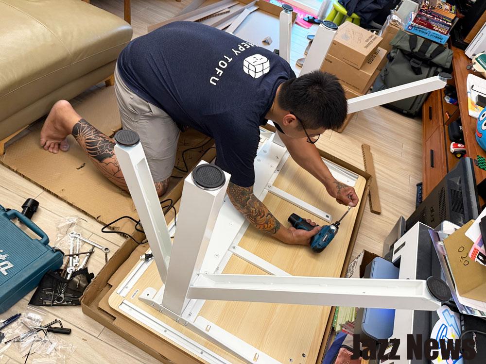 這次有偷懶讓物流小哥幫忙組裝,雖然 Dezctop 的電動桌我已經非常熟且裝過兩款了,但反正費用含組裝就看看小哥有沒有裝得比我好(結果在速度上沒有,哈.. 早知道自己來還比較快,不過組裝後要將桌子抬起也是很累啦,我老人家還是在旁喊加油就好..開玩笑 ^^”)~