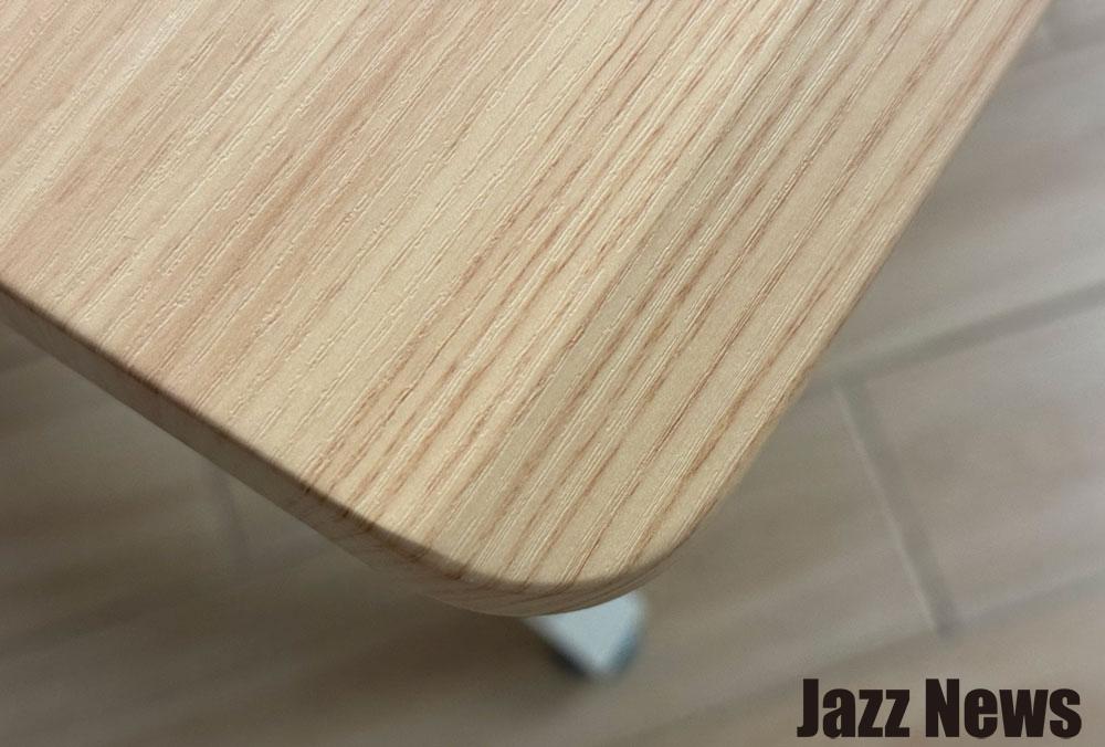 桌板前緣採斜角收邊,依手部自然下垂角度傾斜,減少壓迫感與摩擦痕跡。桌面木紋如同原木而非光滑平面