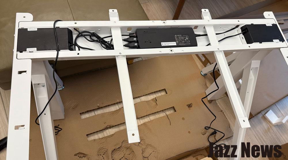 先安裝升降腳,再來安裝強大的承重結構,桌板中段加強雙支撐架結構,有效防止長期受壓變形;這個支撐設計可是很多同類型產品沒有的喔!可見廠商多麼用心、多麼重本!此外可以看到升降的控制盒可以藏在承重結構內,只留下遙控器的控制線和電源線出來(一當與桌面固定後電源線就不好拆卸了,這部分需要留意一下)~對了,升降動力設計可是左右升降腳分別搭載一顆馬達喔!