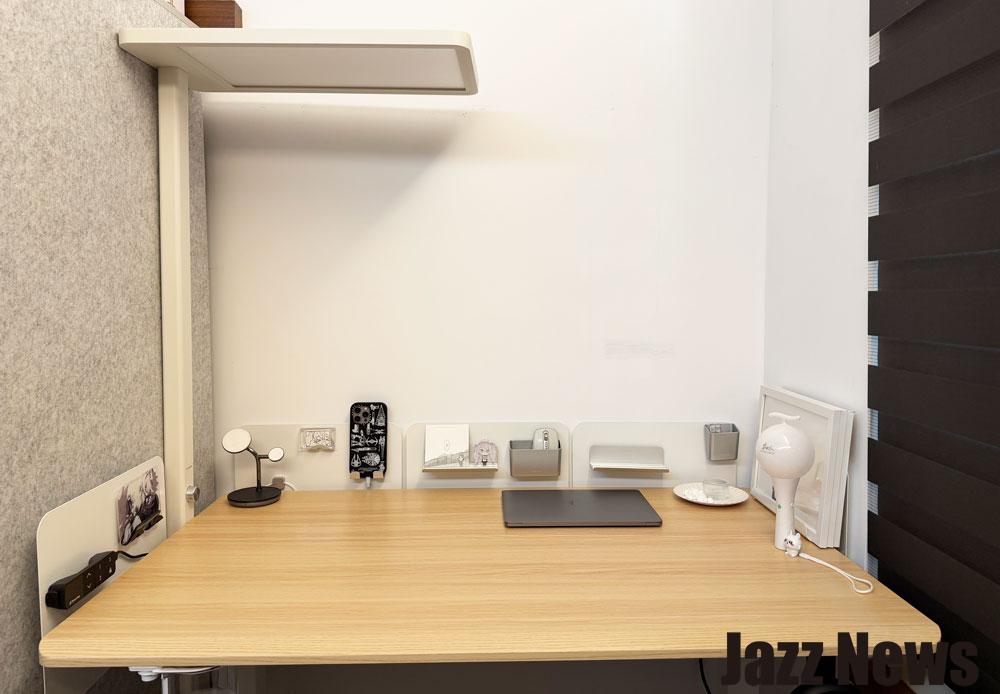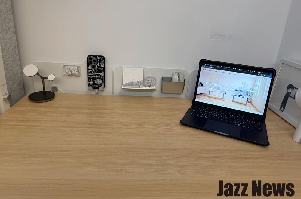 桌上屏風雖然沒有高於桌面太多,但這也是其設計用意,它主要是透過可以磁吸任何物品的鋼製結構搭配溫潤細膩的烤漆工藝,營造出純淨空間,提供安定且專注的享受氛圍。