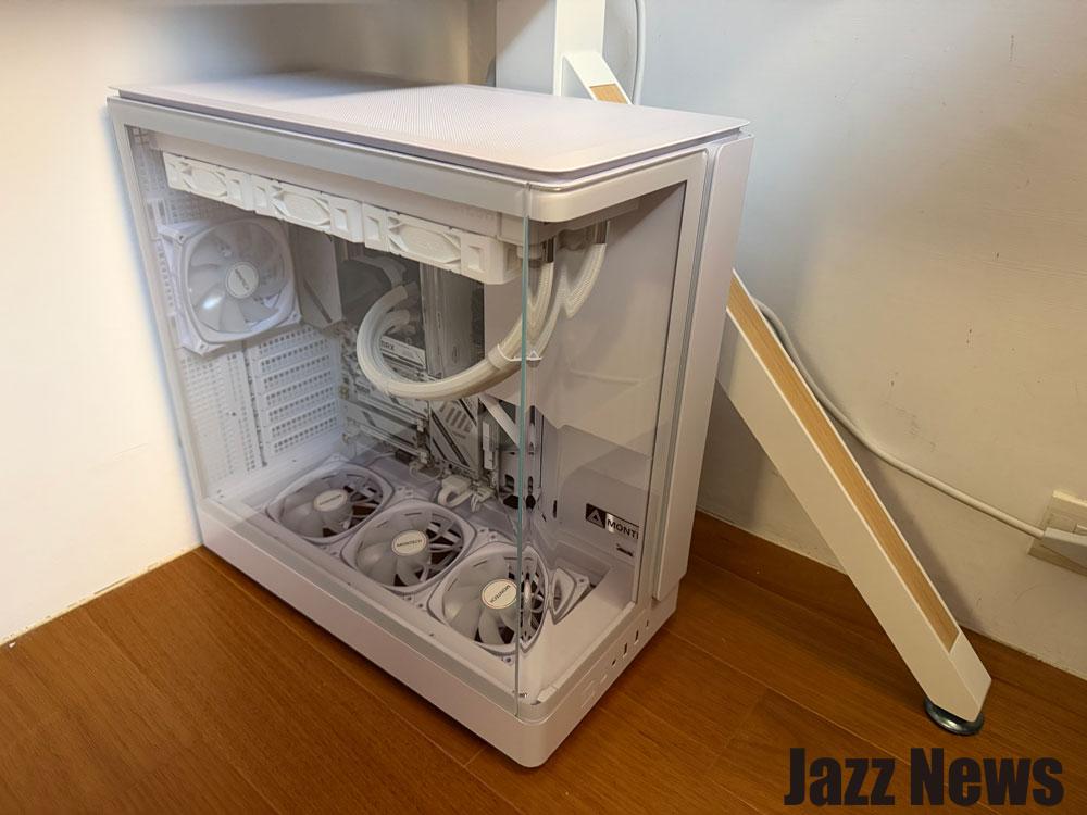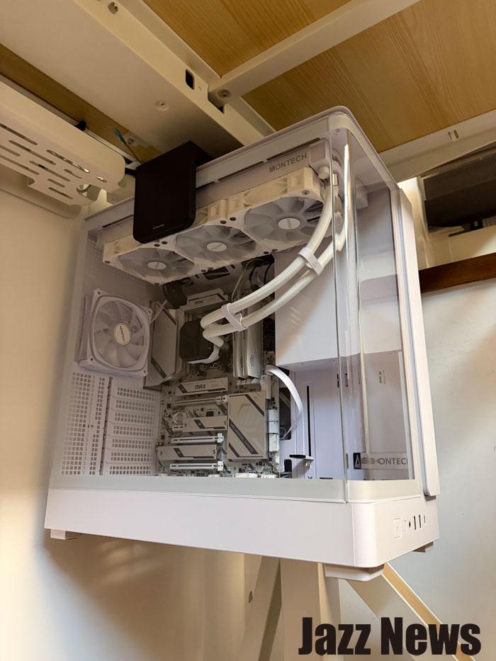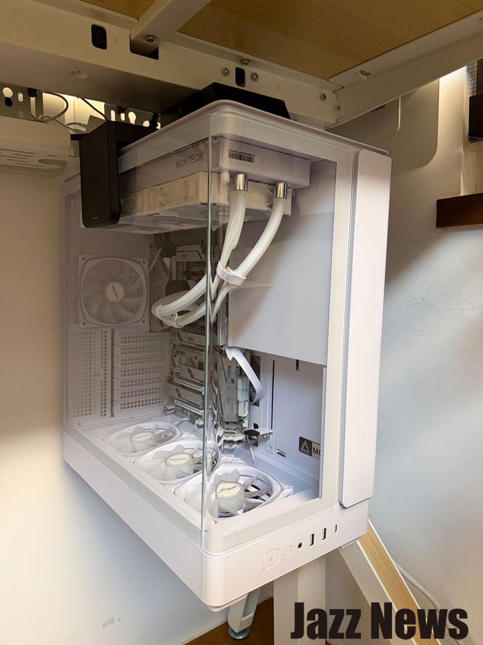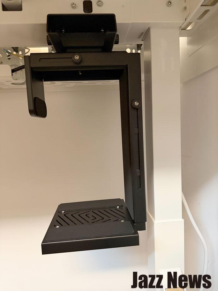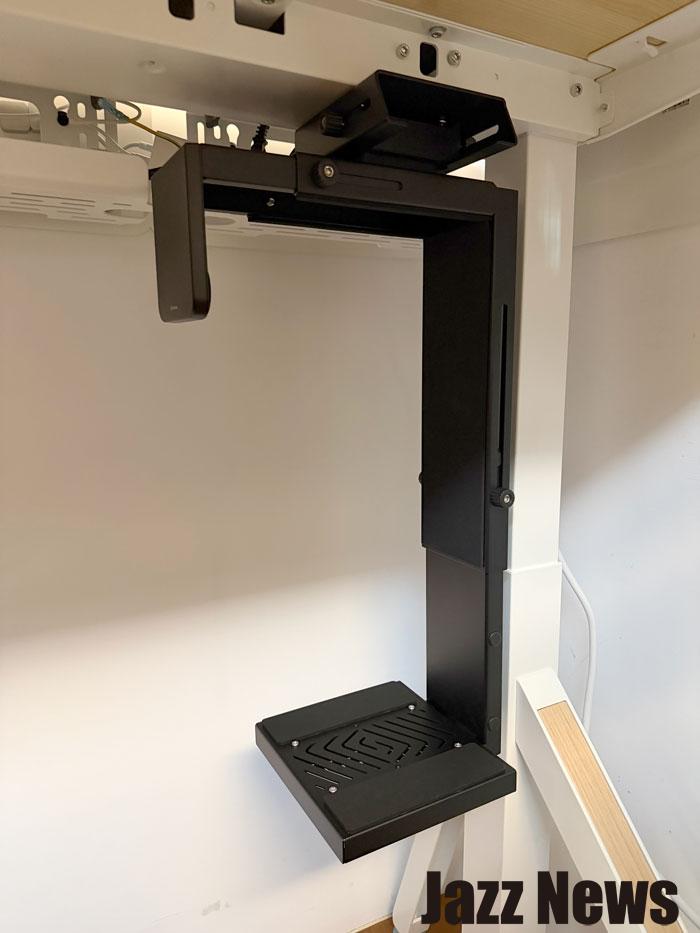 上圖為拉開到最大體積狀態;高度控制部分透過拉桿可輕鬆穩固的調整,支撐架底部還有止滑墊配置至少可以讓電腦主機下方有 3/4 的接觸面積。不過要注意的是,有些電腦主機設計是「寬矮」型,那就有可能無法安裝到懸掛式主機架內(最寬可裝到約25cm,最高則是約 50cm),此外電腦機箱的風流也需要注意一下,像我安裝的這款機殼風流是從下方往上帶出到頂部與後方的,這樣是沒有問題。另外承重也需要留意一下,特別是有安裝旗艦顯示卡的由戲玩家們。