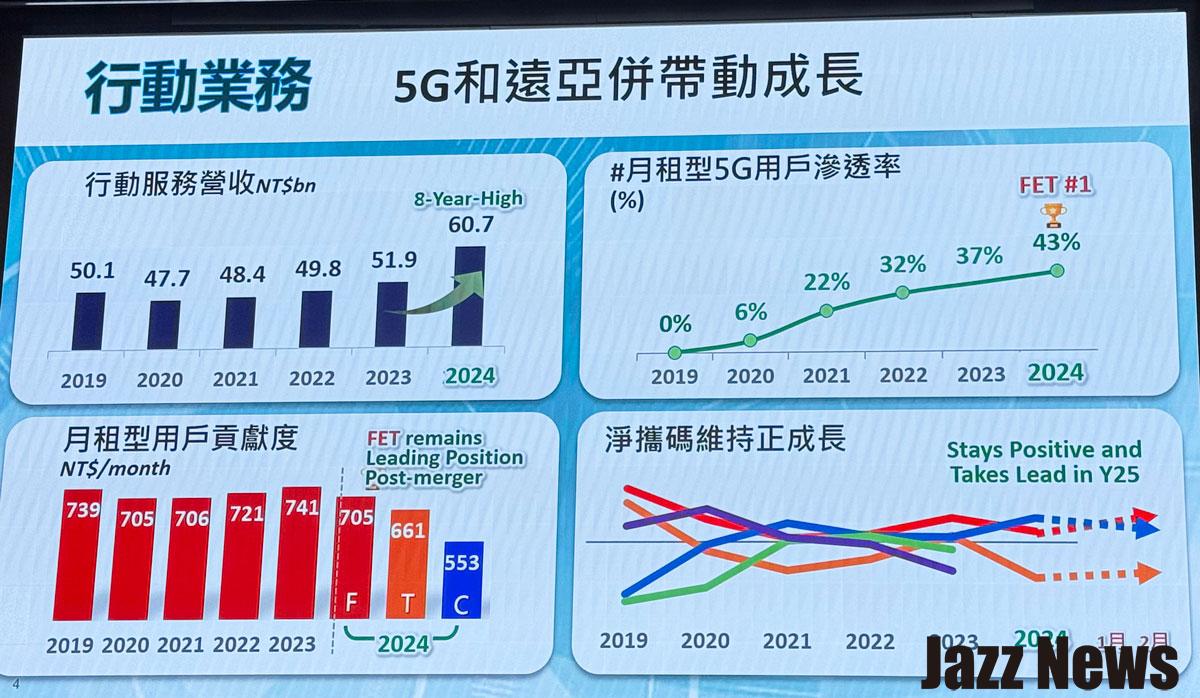 行動業務方面,受惠遠亞合併擴大經濟規模,去年行動服務營收創下近8年來新高,5G月租型用戶滲透率進一步突破43%,續居業界第一;月租型用戶每月平均貢獻度(ARPU)也持續高居業界之冠。
