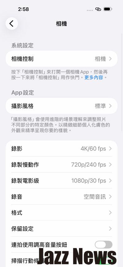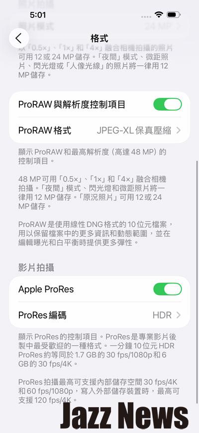 在拍照或是錄影的格式部分設定也很重要!看你要追求高品質還是高相容性,影片是否要使用 Apple ProRes 與 HDR 規格。