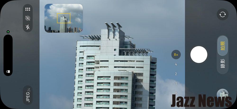 一般拍照模式時可有快速的 0.5/1x/2x/4x/8x 的倍率選擇,最高可往遠到 40x(數位變焦),在8x 或更高倍率拍攝時,會有輔助對焦位置畫面出現來協助抓取要拍攝的物體位置