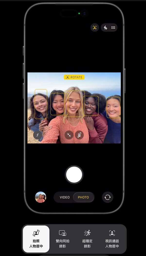使用前鏡頭拍照或錄影時這次新增有人物居中、雙向全拍錄影與視訊通話人物居中功能,其中我覺得雙向全拍錄影功能超實用!也非常有感 1800 萬像素規格帶來的畫質提升!相信這也讓大家更願意用 iPhone 來自拍了!