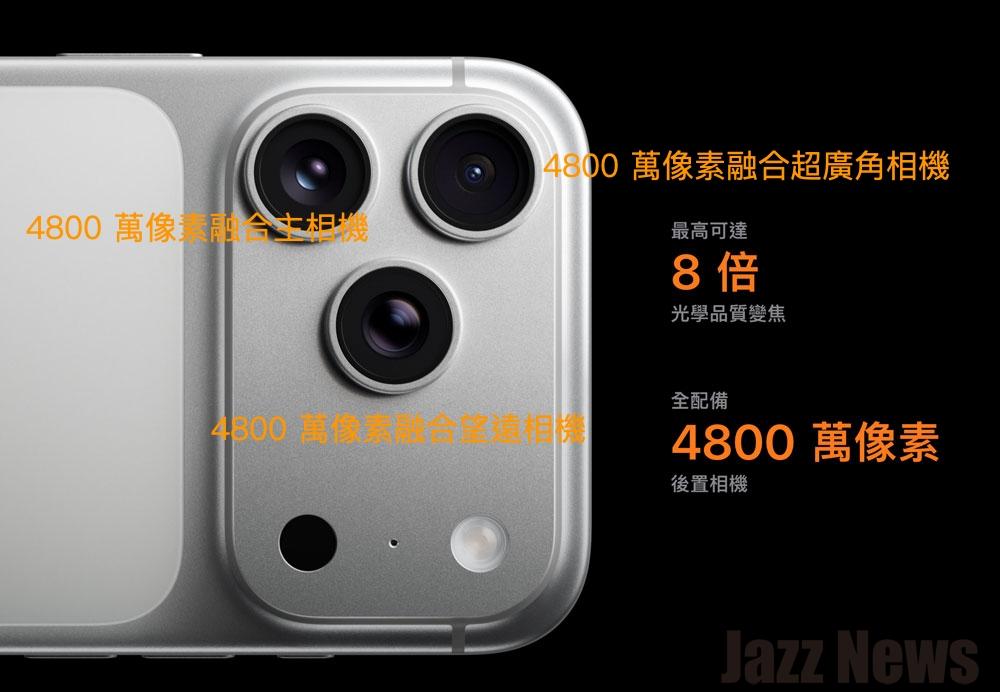 三顆都是 4800 萬像素融合相機系統:主相機、超廣角以及全新望遠相機,等同於提供八顆鏡頭的組合,帶來iPhone 歷來最長的 8 倍光學等級變焦。