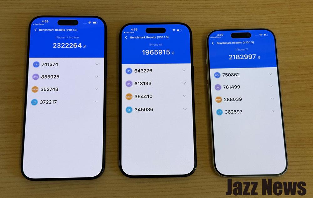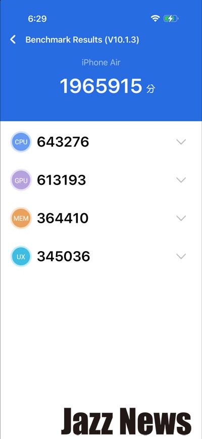 iPhone Air 搭載 Apple 自家高階的 A19 Pro 晶片,不過可能為了散熱拿掉一個 GPU 核心效能,但表現依然亮眼!