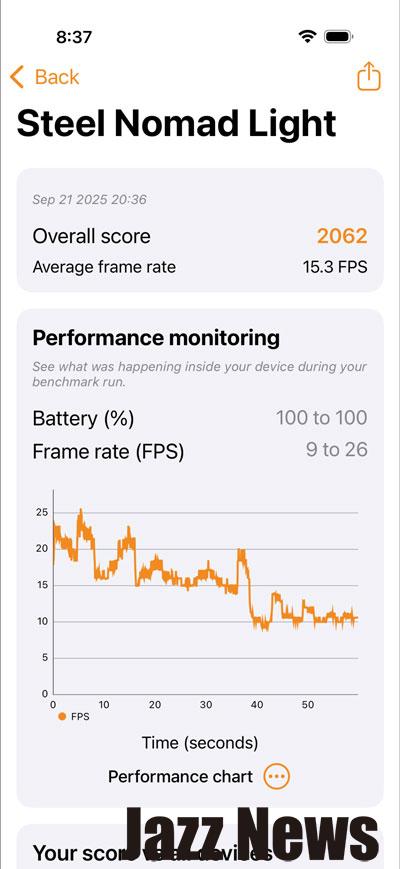 這邊兩個成績都比 iPhone 17 Pro Max 還低,代表拿到一個核心的 GPU 效能確實有受影響