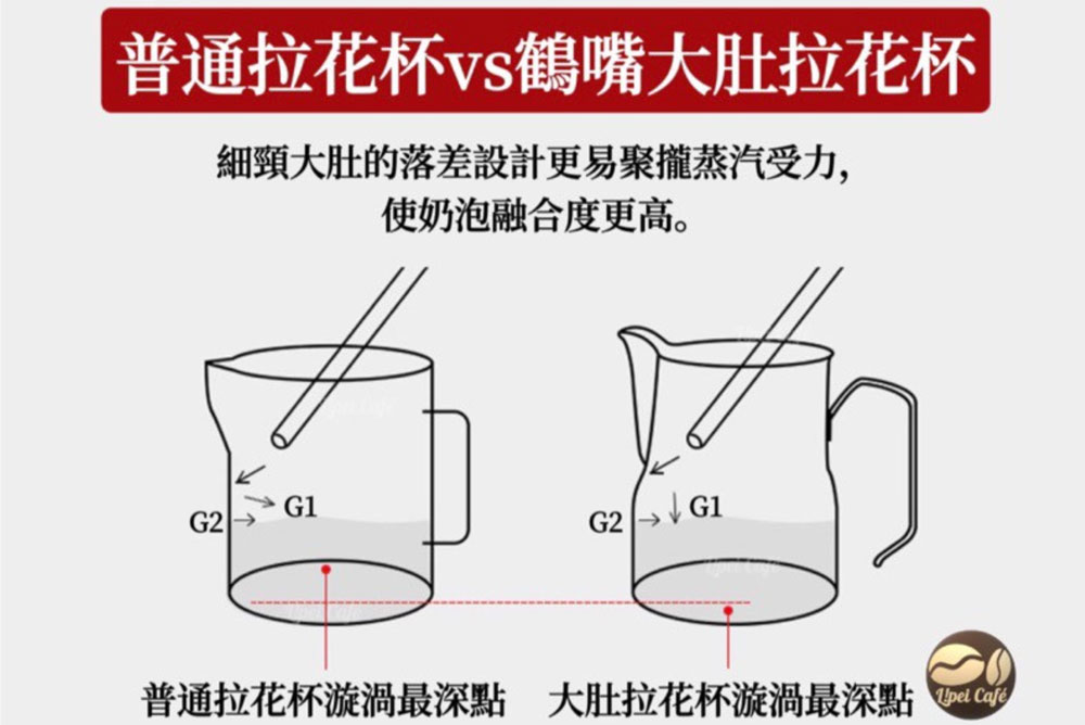 這邊也提供官方的「鶴嘴款採獨特細頸大肚杯身」設計和一般拉花杯的差異給大家參考(真的是相當聰明的設計啊,實際比較起來確實比起一般拉花杯的奶泡綿密度更優,讓拉花掌握度更加順手)~