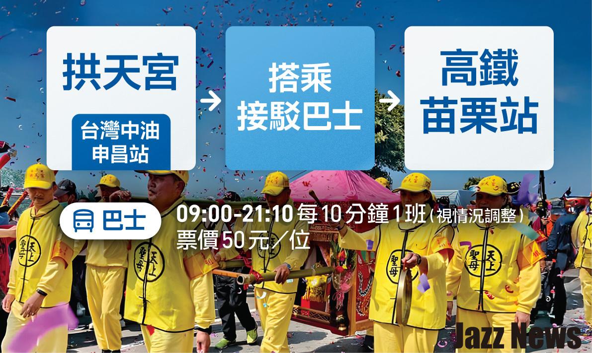 5/11白沙屯媽祖徒步進香回鑾 交通部大幅投入70輛車 卯足全力至少可開行230班次!全民追隨白沙屯媽祖熱潮火熱!白沙屯媽祖自5月1日深夜登轎啟程,為期10天9夜的北港朝天宮徒步進香行程,即將於5月11日回鑾,交通部陳世凱部長今日於道安記者會後,特別向媒體說明,交通部及公路局已規劃再開「白沙屯拱天宮往返高鐵苗栗站直達公路客運路線」,不但增加調度70輛(原規劃30輛)大客車投入疏運,也將從原規劃13:00發車提早至上午09:00發車,班距約10分鐘1班,拱天宮站搭乘地點為台灣中油申昌站,距離拱天宮牌樓步行5分鐘,距離約200公尺,收費一樣是全票50元(半票25元),當天準備預置的70輛接駁車依需求至少可開出230班次提供信眾搭乘。
