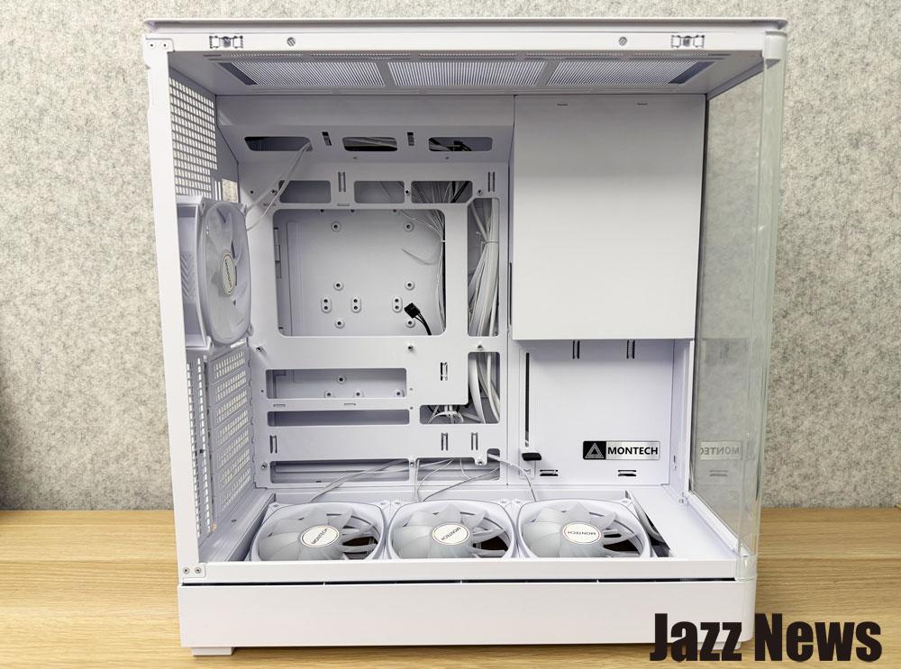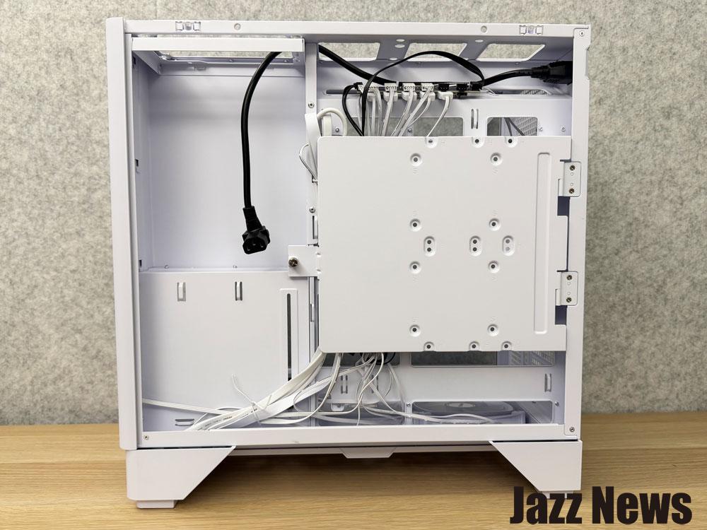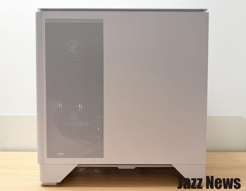 機箱另外一側的面板有開約 2/3 面積的網孔,讓 PSU 的風扇可以在這邊導出氣流;這邊也可以看到底部有足夠的高度讓底部的風扇可以導入風流進入機箱內來做煙囪式的流動~