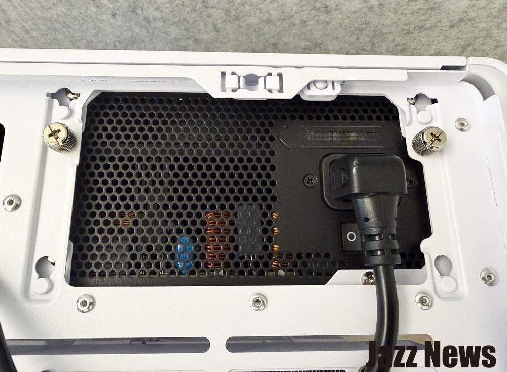 PSU 部分有個固定架設計,安裝 PSU 到固定架後再將兩顆可直接手轉的螺絲固定就完成固定 PSU 到機殼的動作;內附一個電源轉接線到機殼後上方~