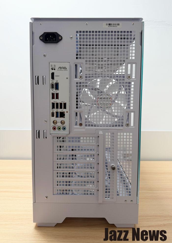 機殼後方如上圖,可以看到有一顆 AX120 PRO 120mm 風扇用來導出機箱內的風流;另外有 PSU 的電源線轉接孔,最多可以安裝七張介面卡的後 I/O 擋板,所有介面卡的擋板都有方形網孔來做散熱孔用,完美增加氣流效率~