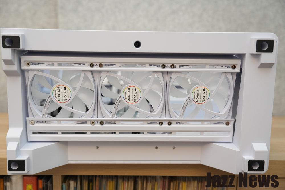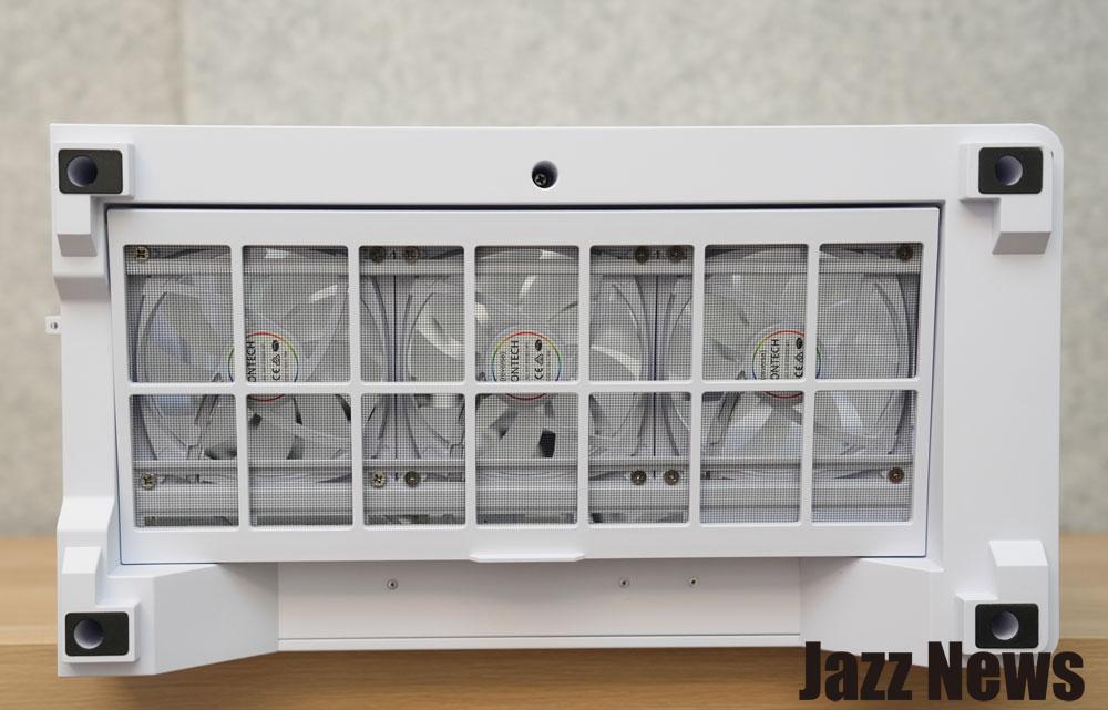 底部預先安裝好的 RX120 PRO 120mm 風扇共有三組,都支援 ARGB 與轉速控制,底部有防塵網可隨時可拆卸清潔相當便利~
