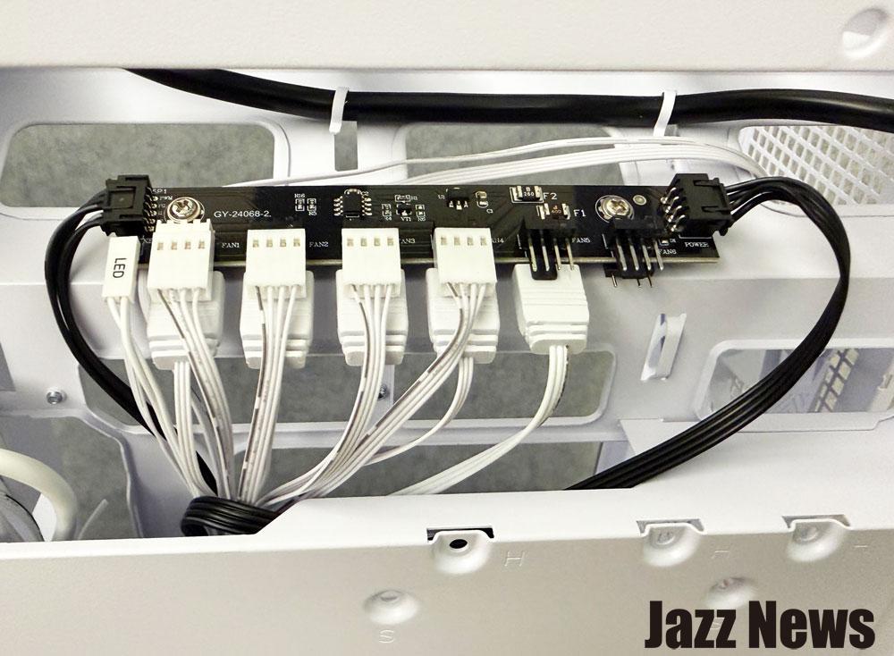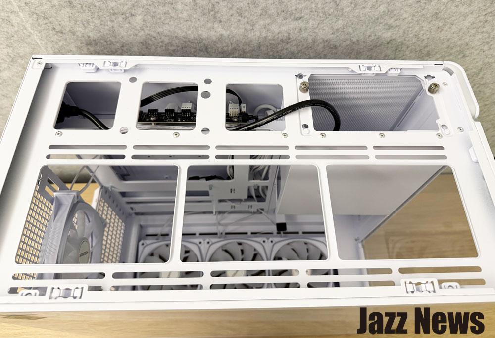 頂部可以看到配置了整合所有風扇的 ARGB / 轉速 / 供電 的控制電路板,透過控制板接出來到主機板上就可以讓燈效一致,而不用費心到主機板 BIOS 或系統軟體內去做分別設定~