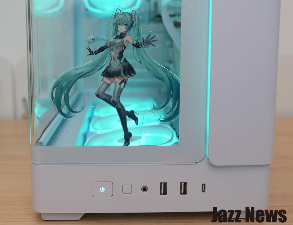 前面板下方有由左至右有 帶燈的電源鍵、LED 燈效切換鍵、若非 Pro 版則為 Reset 鍵)、3.5mm 耳麥孔、兩組USB 3.0 , USB Type-C 。此外,前面板採卡扣式設計,可以隨時輕鬆拆卸。