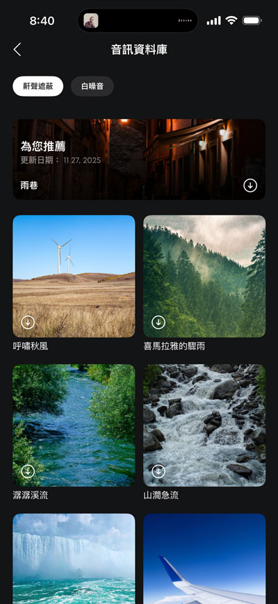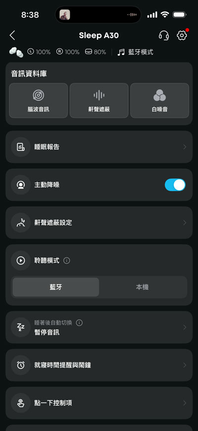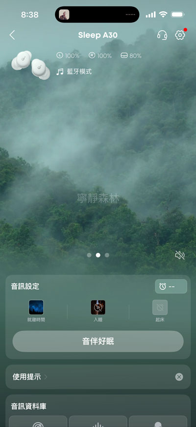 Sleep A30 的專屬設定介面如上,可以快速掌握電量以及播放各種助眠音訊~