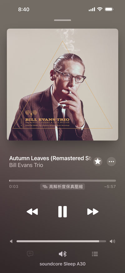 播放爵士音樂效果極佳!在這張剛重置發行的 Bill Evans Trio 專輯內相當經典的「Autumn Leaves」,可以聆聽到 Apple Music 高解析度保真壓縮的高音質無損音樂魅力,銅拔與鋼琴的高音清脆響亮、Bass 與鋼琴低音鍵低沉舒適悅耳,整首曲目節奏感舒適爽快,馬上讓大家隨之急性搖擺!而下一首曲目「When I Fall In Love」相當柔情,馬上放鬆下心情,適合看書或者在睡覺前播放,這時記得設定一下鬧鐘關閉掉音樂就會更加好眠喔(如果不需要降噪的話)!
